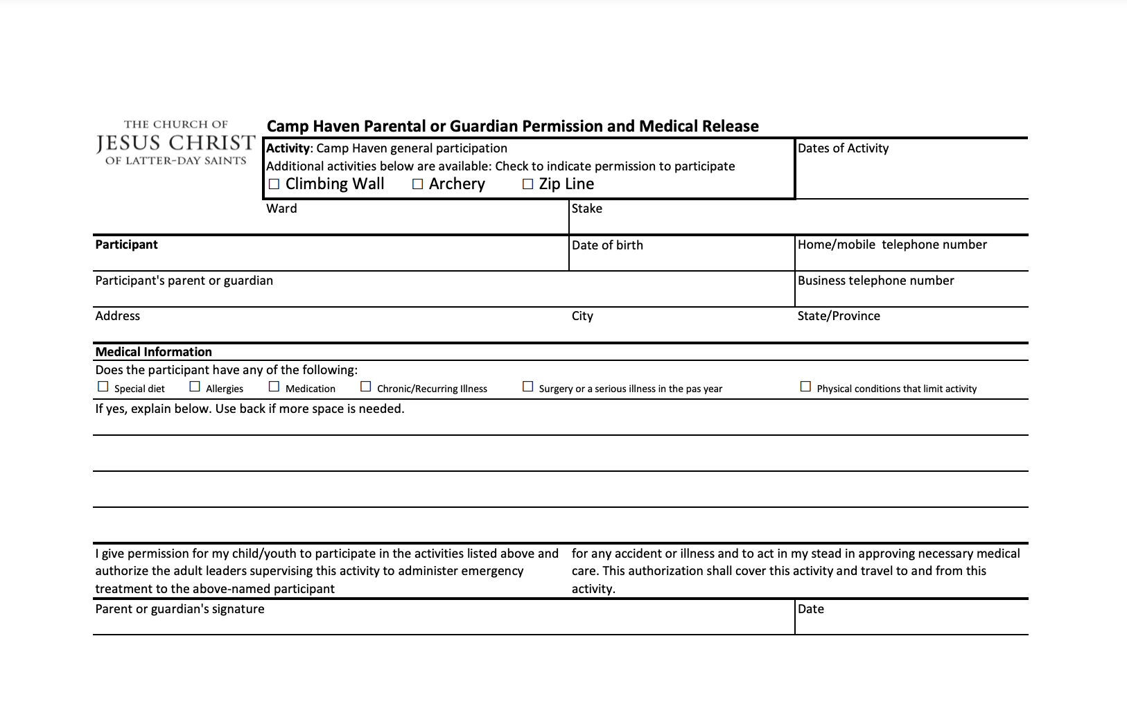 Please click on the form below and print. Fill it out and hand it to your ward young women leaders or ward camp director.